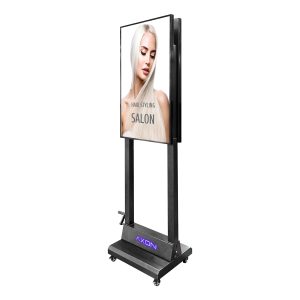 自主研发 43 英寸双面橱窗广告显示屏,双屏均可旋转,高度可任意调节。外侧屏幕采用动态背光方案,亮度为 4000 尼特;内侧屏幕亮度为 700 尼特。