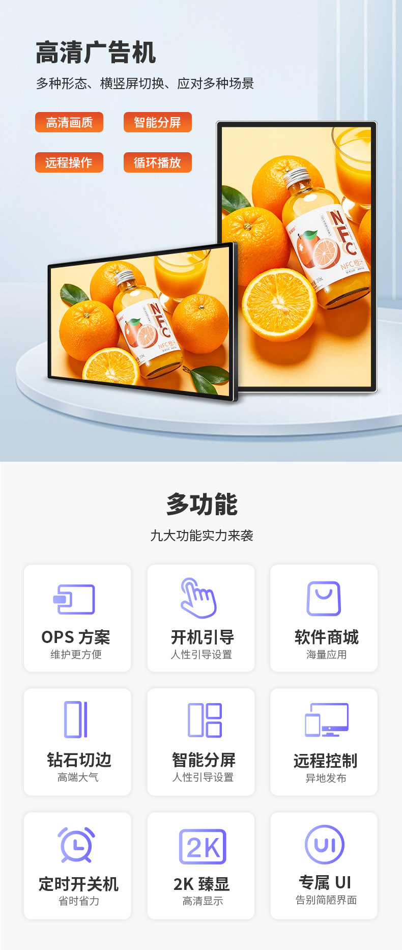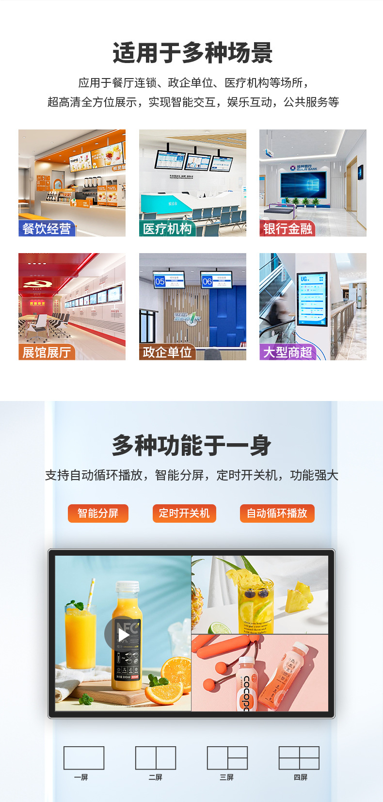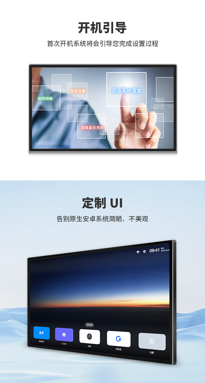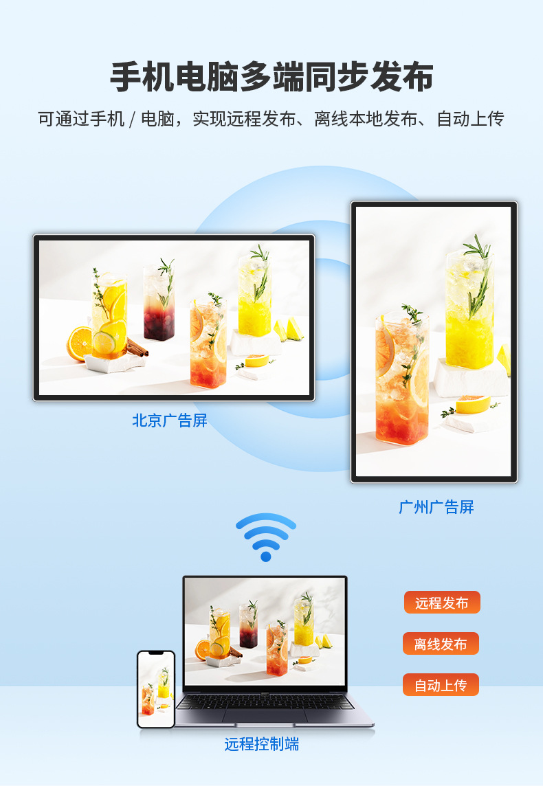壁挂式LCD广告机,支持多尺寸选配,采用室内高清高亮IPS屏,内置云端发布系统。全面支持手机、PC、U盘及网络传输,可实现远程集群预发布管理。