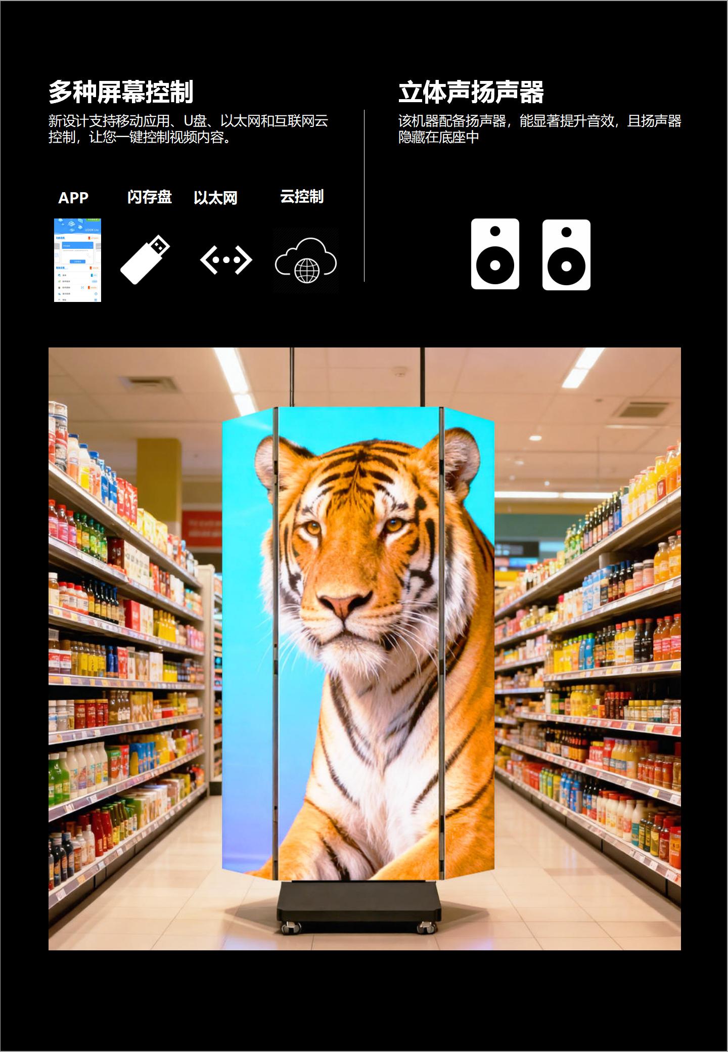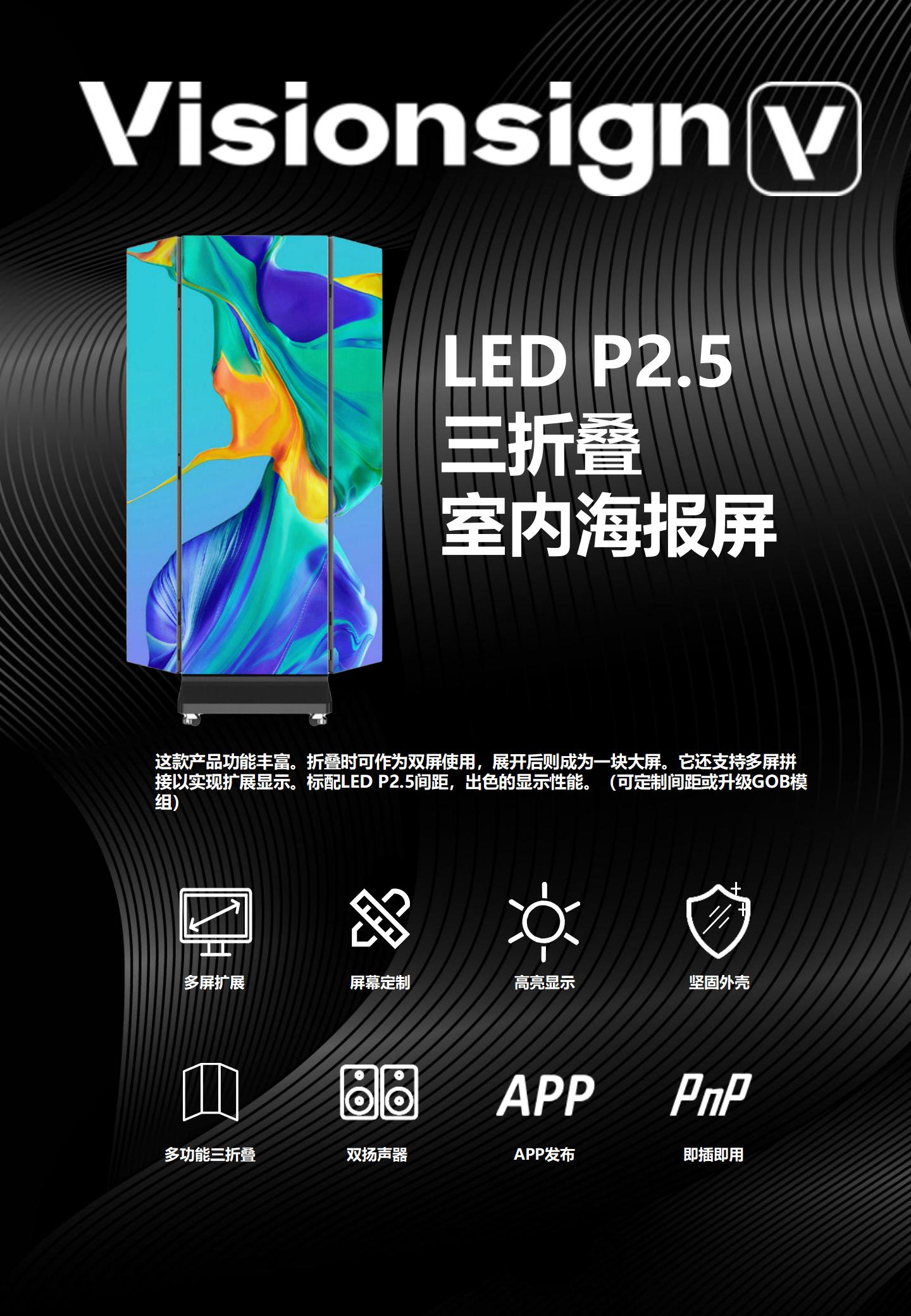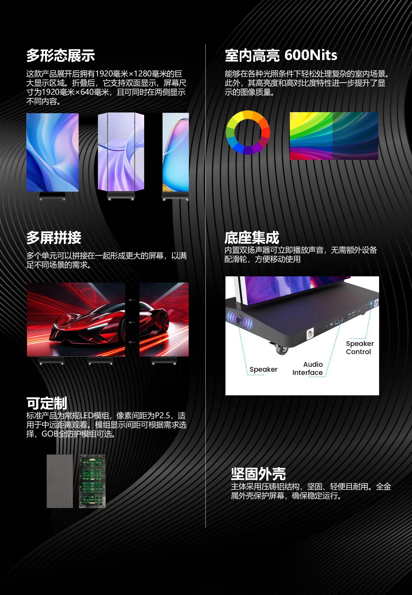 本产品功能丰富,显示效果惊艳,折叠状态下可作双屏使用,展开后则为单块大屏。同时支持多屏拼接,实现拓展显示。标配 P2.5 像素间距,显示效果卓越。(可定制不同像素间距, GOB 模组可选。)
